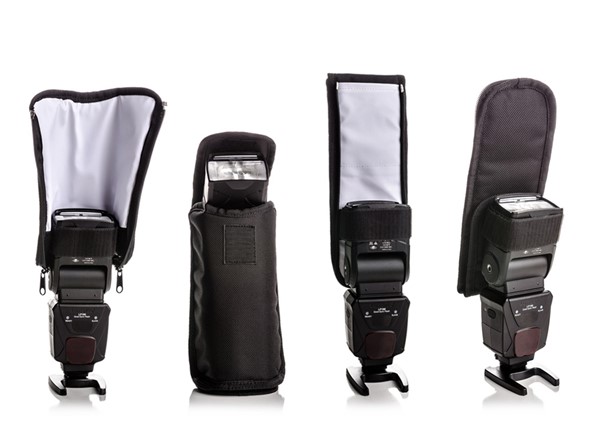 This case transforms into good protection to transport your flash, into a triple purpose reflector system. Either you have a good wraparound white rector to soften and spread, or a single strip to just bounce back. Or if you need a black trip to kill some of the bounce, you get that too.